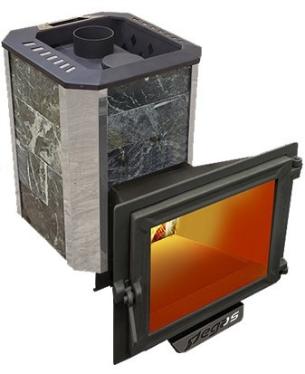 Печь оснащена закрытой каменкой из жаропрочной нержавеющей стали; обеспечивается максимальный нагрев камней и длительное сохранение тепла, современный дизайн печей, закрытая каменка относится к невентилируемым системам, за счет этого создается равномерная температура без перегрева с поддержанием комфортного режима длительный период времени, пар мелкодисперсный, мягкий, с легкой структурой, наиболее нагруженные элементы печи изготовлены из 8 мм стали,корпус печи сформирован с интегрированными ребрами жёсткости, без применения сварки, что значительно снижает нагрузку на строение металла, тем самым увеличивает срок службы печи. Печь оснащена выносным топливным каналом, позволяющим топить его из смежного помещения, топка большой ёмкости, позволяет загрузить большое количество дров, чугунная колосниковая решетка, выдвижной зольный ящик, дополнительные отверстия для притока воздуха, позволяют произвести нужную регулировку горения, приёмная чаша-дозатор для подачи воды в закрытую каменку. Облицовка камень змеевик 20 мм толщина.